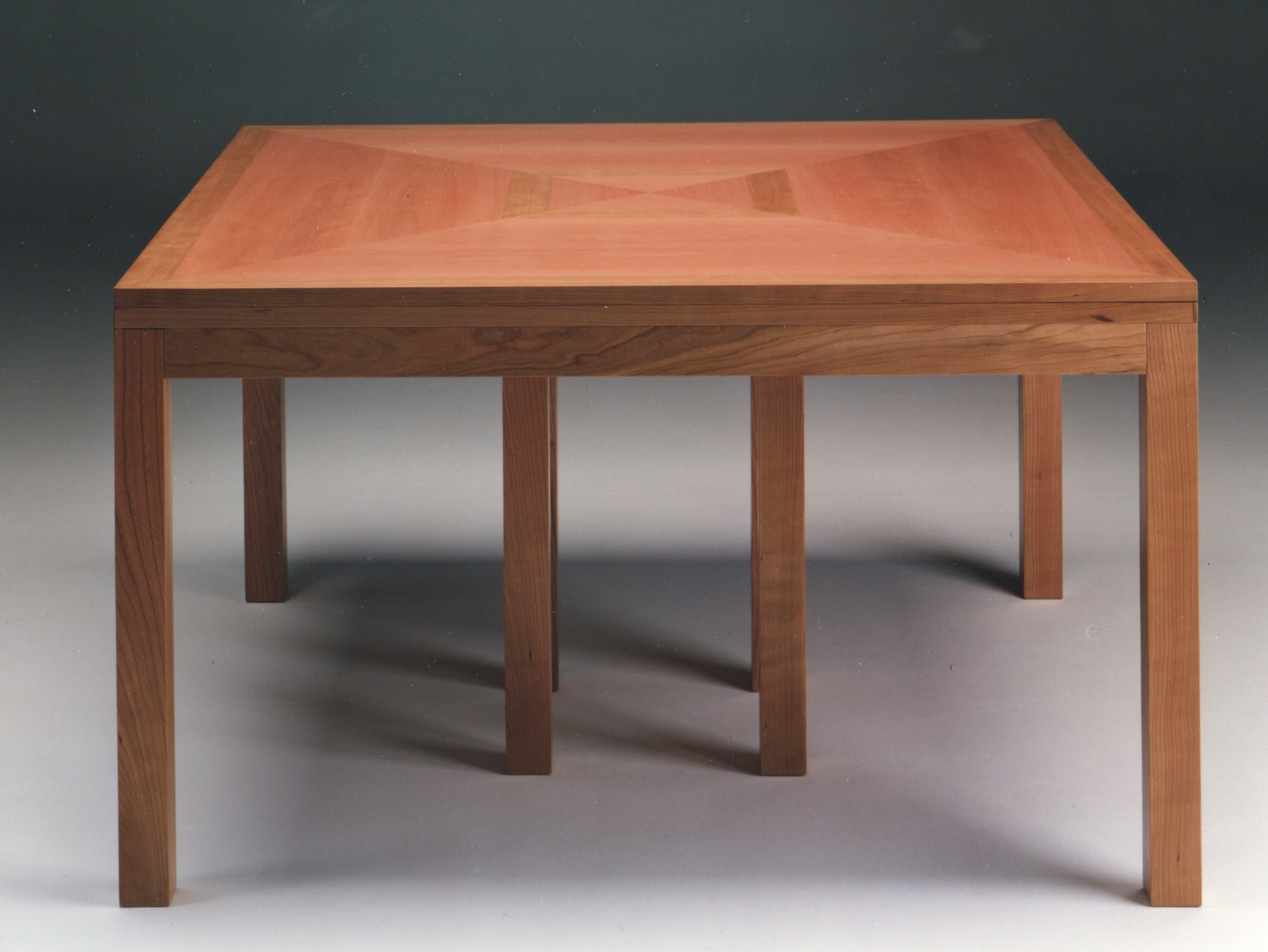 Table inlaid in cherry and pear. Table produced by the Meccani Arredamenti company in the early 90s in a few pieces.