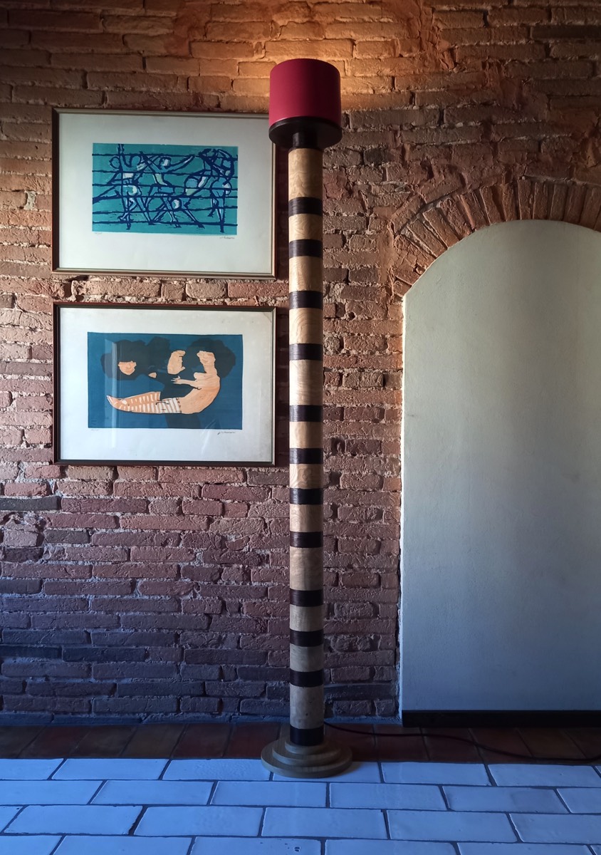 Floor lamps in hand-turned and inlaid wood, hight terminal part in white terracotta (biscuit) glazed in yellow, green, red, pink and white. Essences of oak, ash root and wengé.