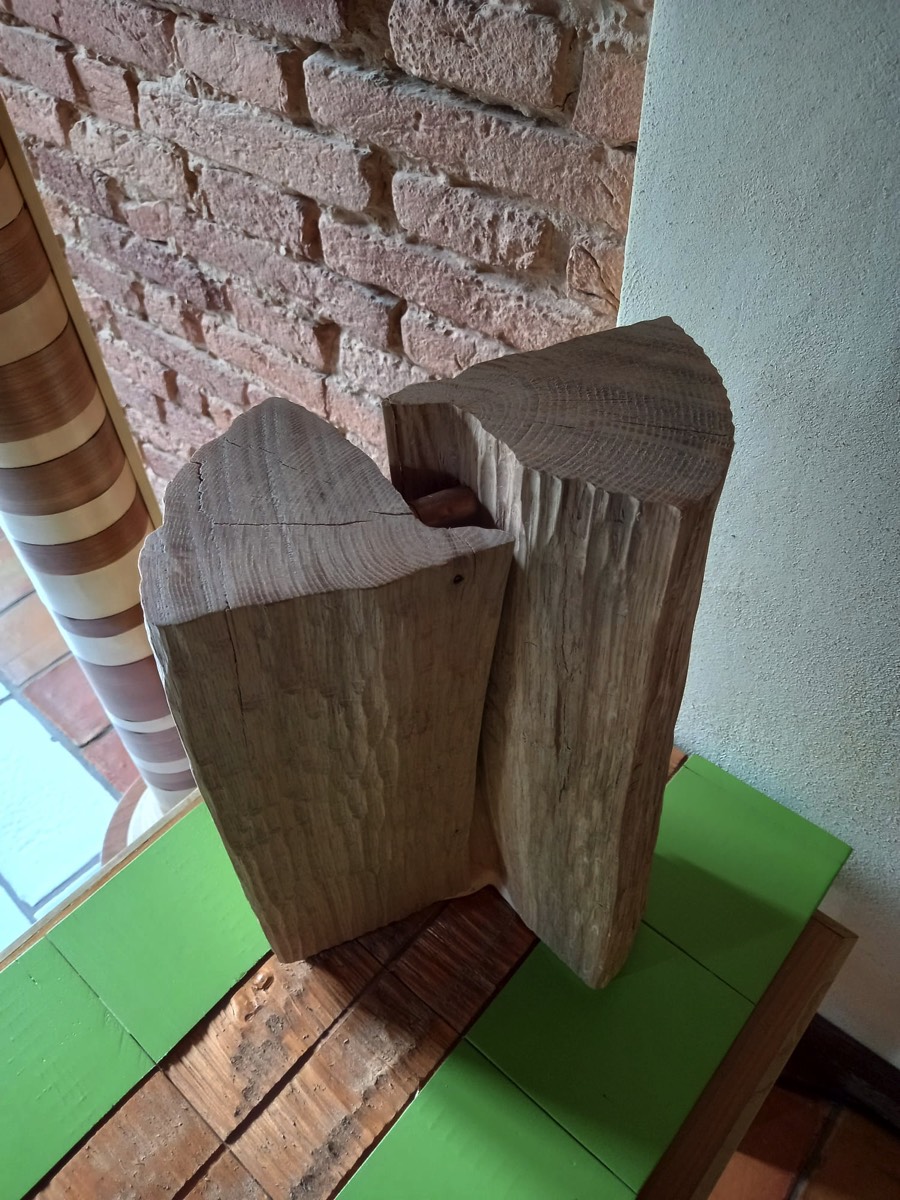 Carved wooden sculpture. The two wooden trunks embrace each other and are connected through a copper element. Unique piece made by hand.