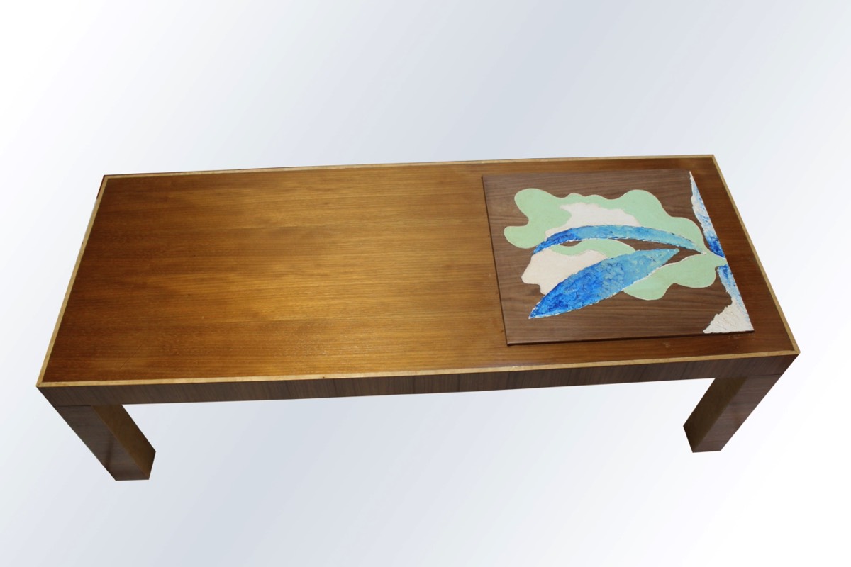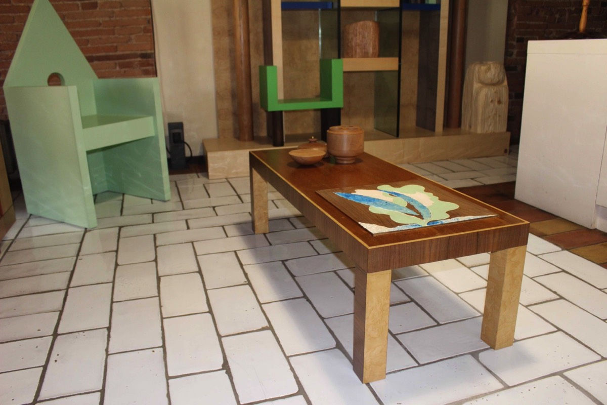 Artistic table made and decorated by hand. Wood and non toxic water-based paint. Decorated by hand. In wood with walnut and ash burl finish.