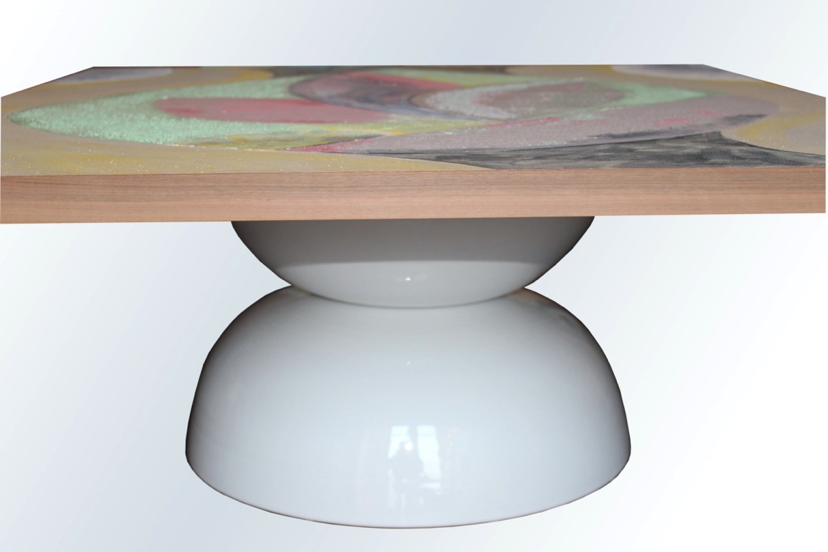 Hand - painted small table with non-toxic water paint, cork insert. Edge in walnut. Turned white ceramic base