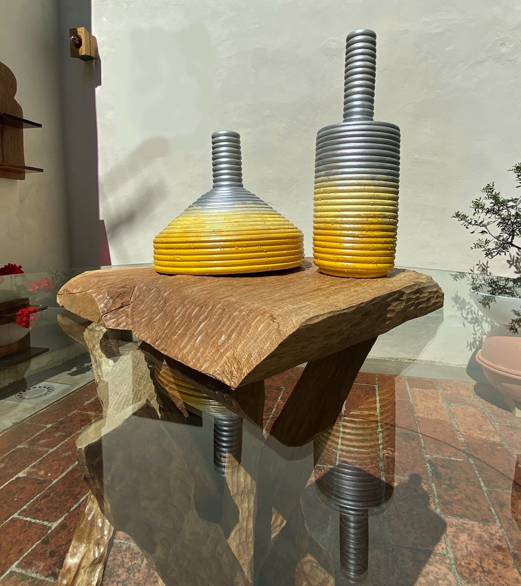 Handmade "biscuit" terracotta vase decorated with mixed hand technique. Base in hand-carved oak.
