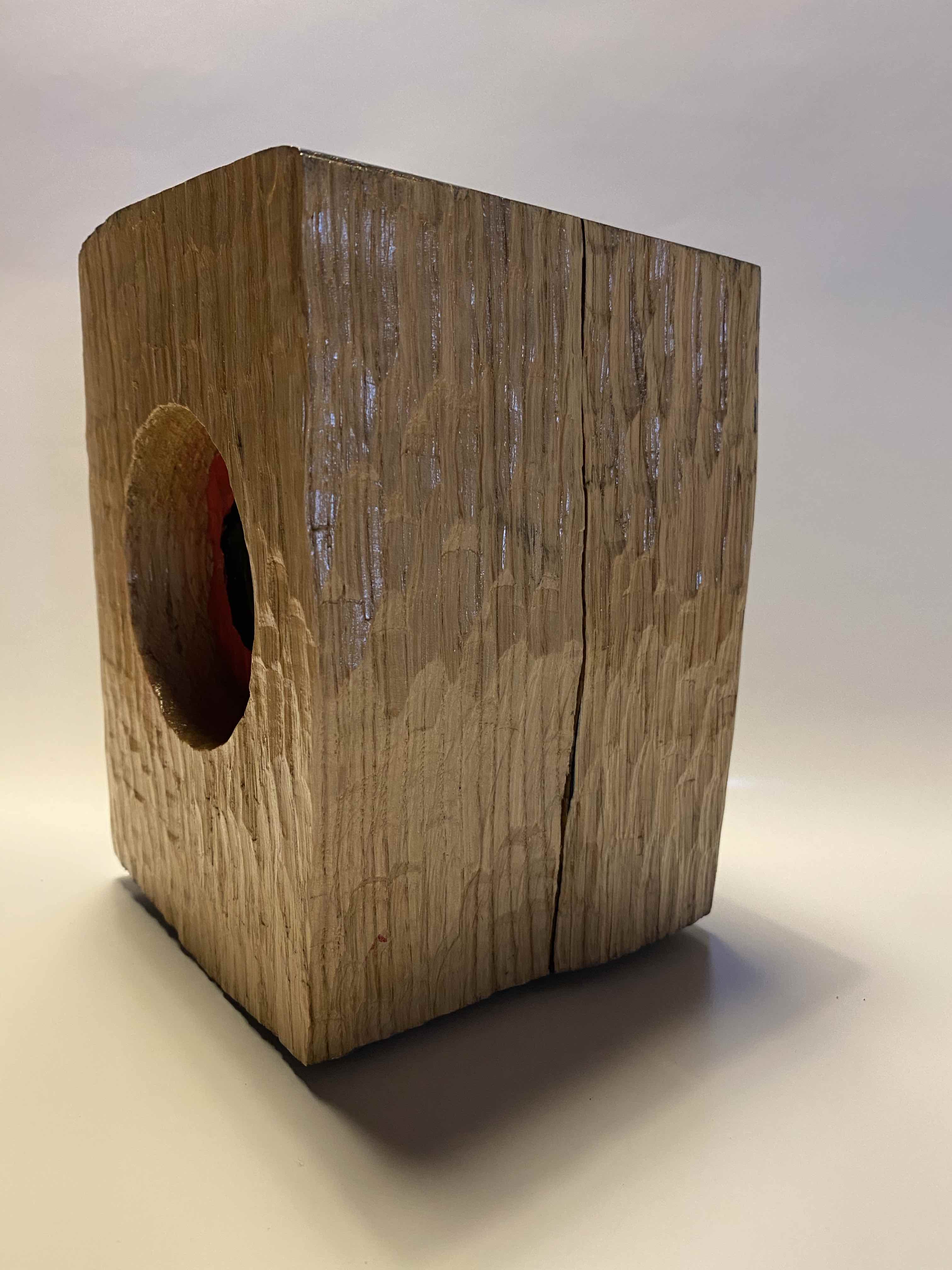 The "Pellicola" Collection of hand-carved oak wood lamps is inspired by the old cameras of the early 1900s . The volume in sculpted oak contains a red painted telephoto lens with the bulb , ideally adjustable .