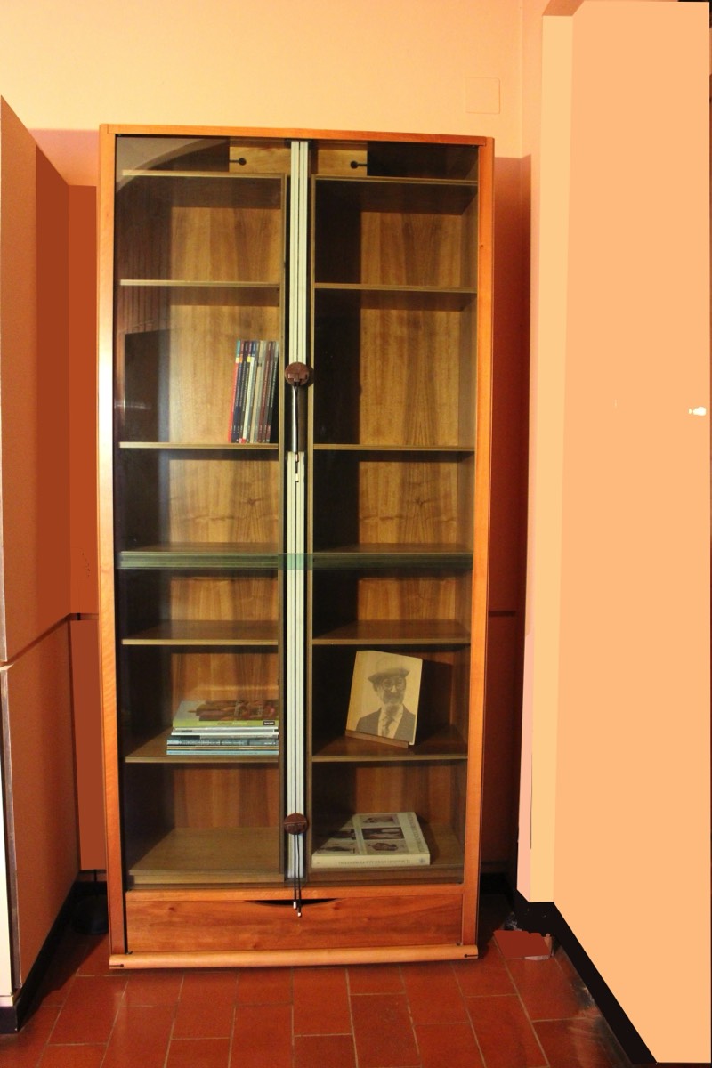 Bookcase in walnut and glass.