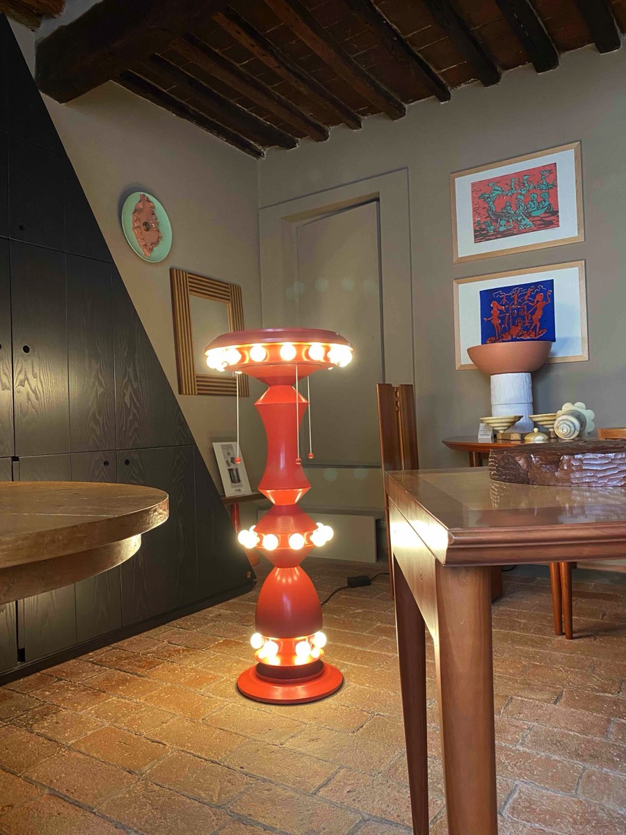 The "Giostra" Lamp ( inspired by Fellini's films ) was designed by Ferdinando Meccani in 1987 for the Salone del Mobile in Milan and for the Exhibition Abitare il Tempo in Verona .