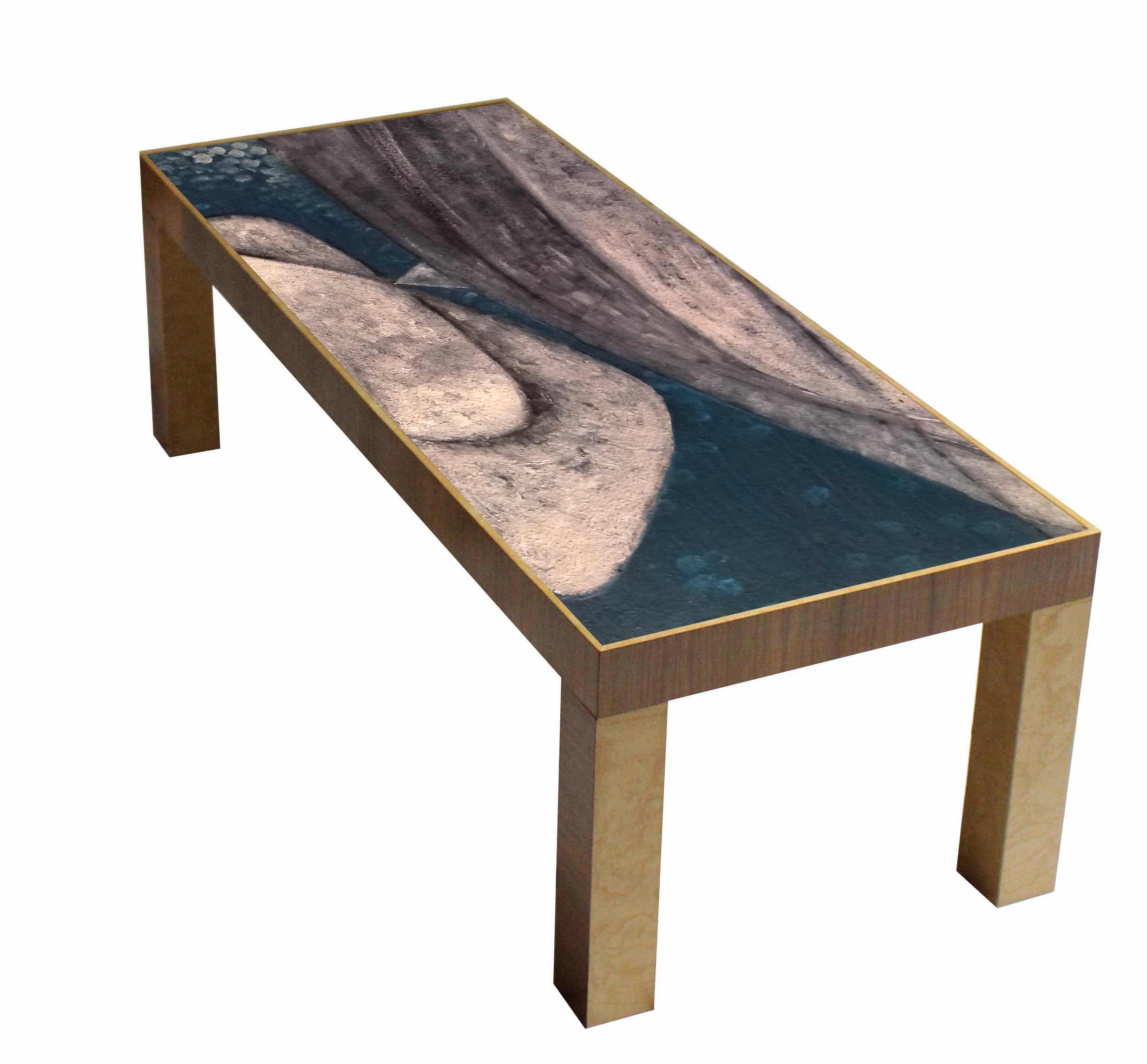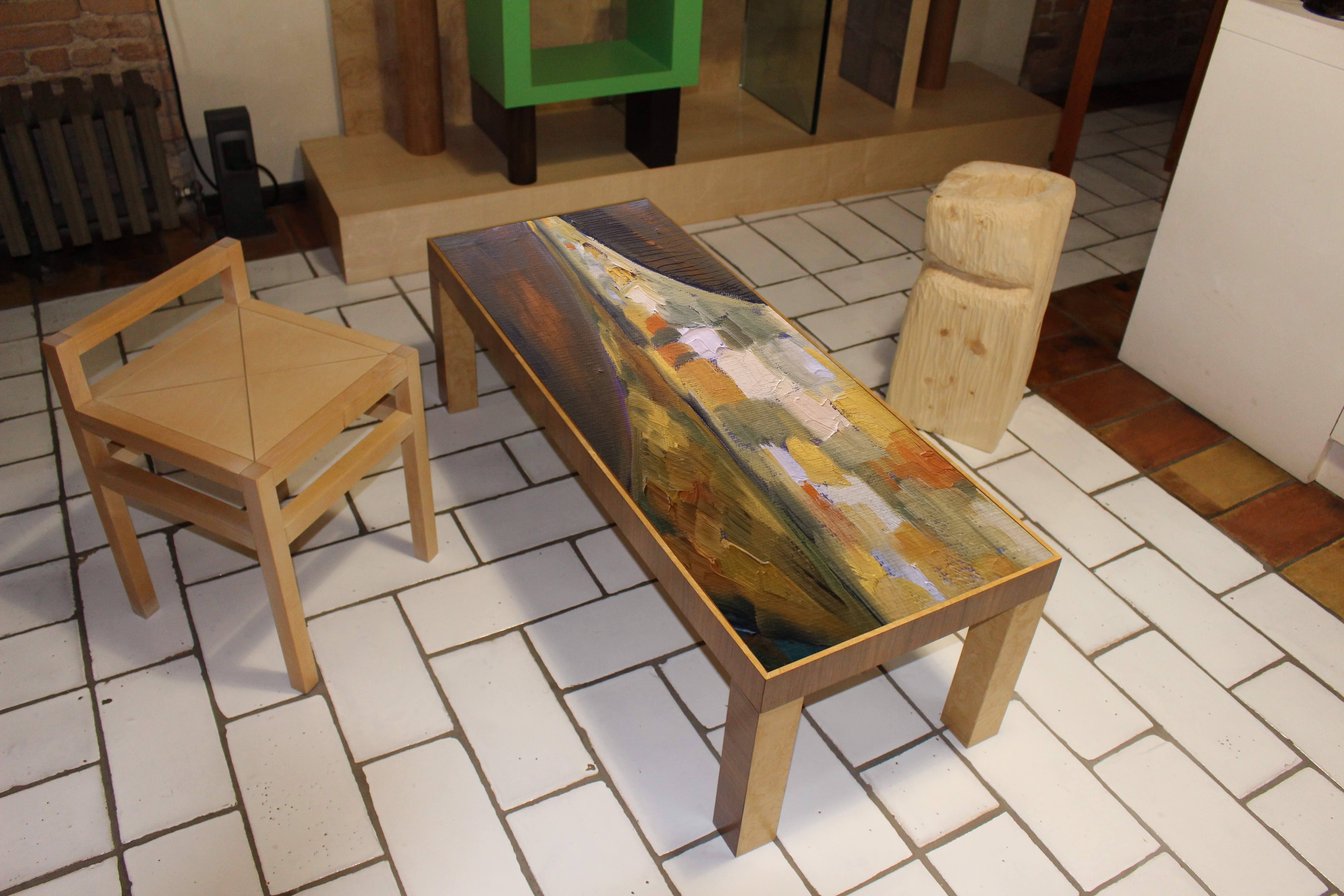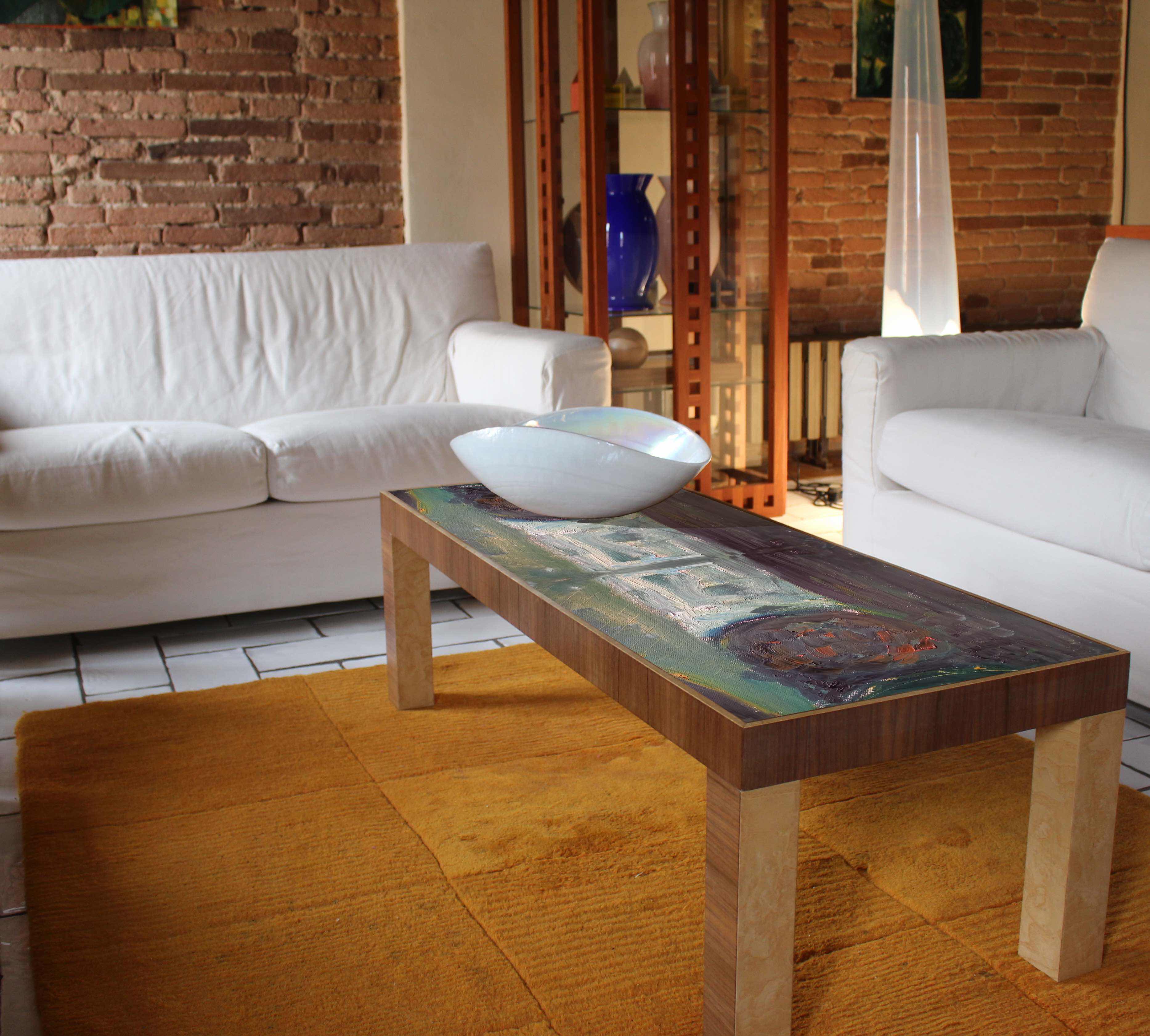 Coffee table in wood with walnut and ash burl finish. The top is hand decorated with oil paint.
