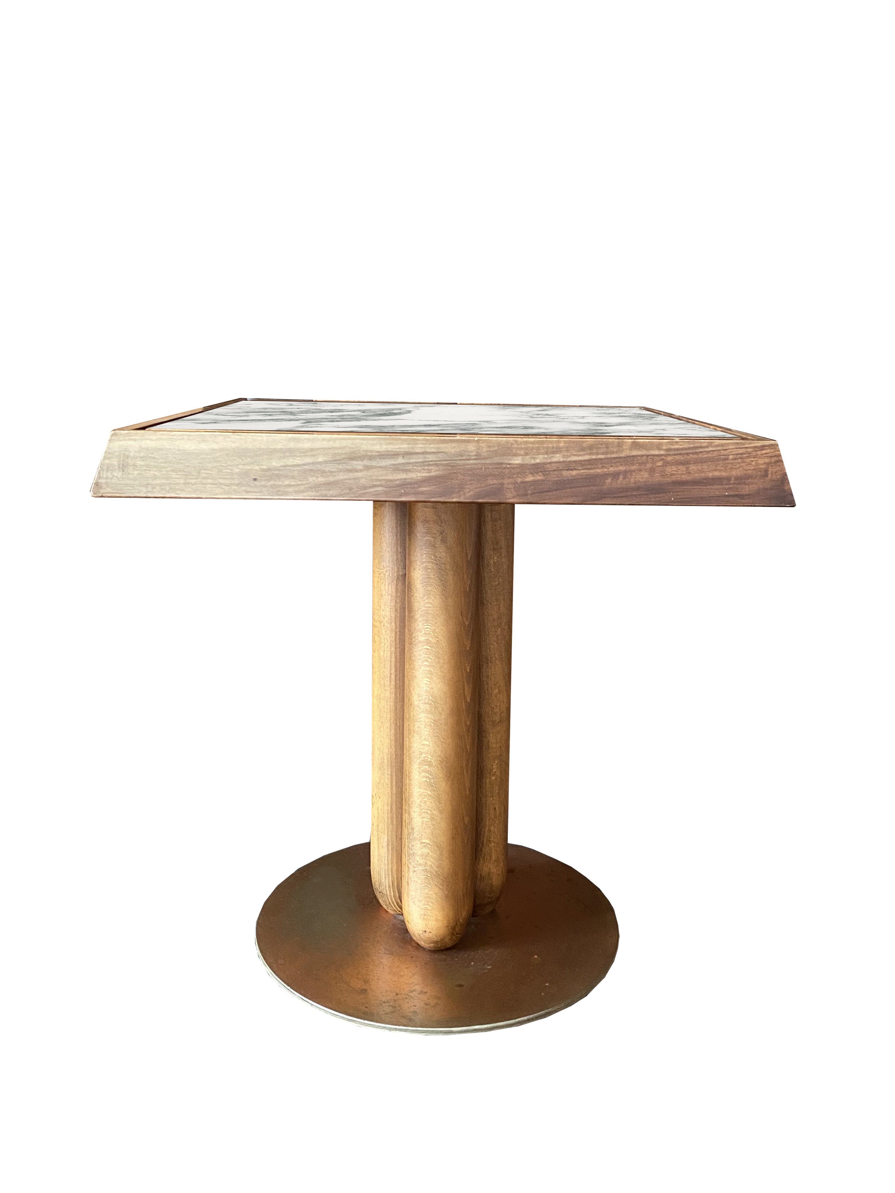 Coffee table made of walnut with copper base, number three turned columns, frame in walnut and top Luana marble.