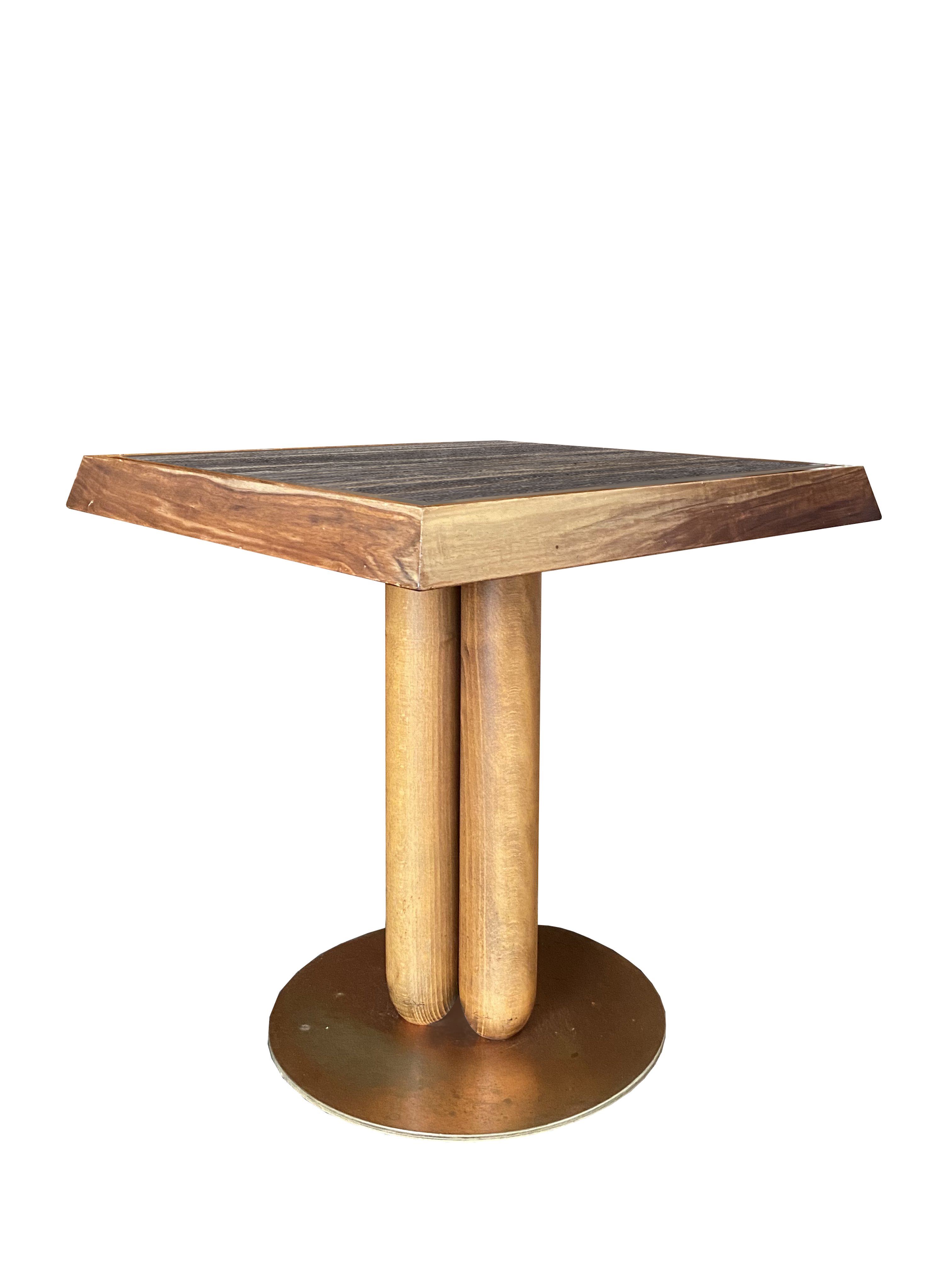 Coffee table made of walnut with copper base, number three turned columns, frame in walnut and top Cardoso stone.